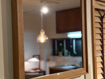 お部屋の中央部分に設置との事、裏面も化粧がされているので間仕切りとしても使用できます。全体を無垢材の家具を使用されている素敵な空間です。床もナラ材です。以前納品した、鬼くるみのベンチも丁寧にご使用くださっていました。海外のクルミと国内のクルミの共演空間です。