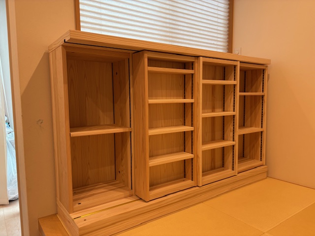 広島県広島市西区に杉のオーダースライド書棚を納品しました。