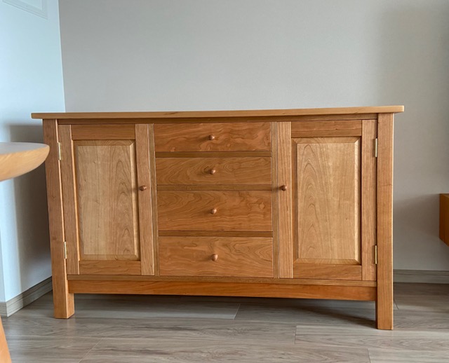 前と後ろの足というか柱になる部分が無垢で上下も無垢材がつかわれ、木の歪みを防ぐために突板です。