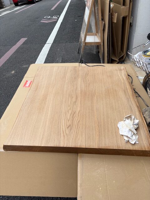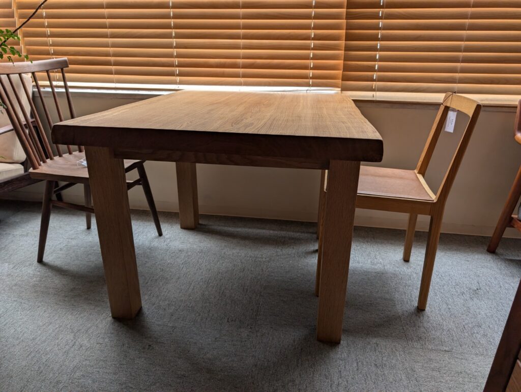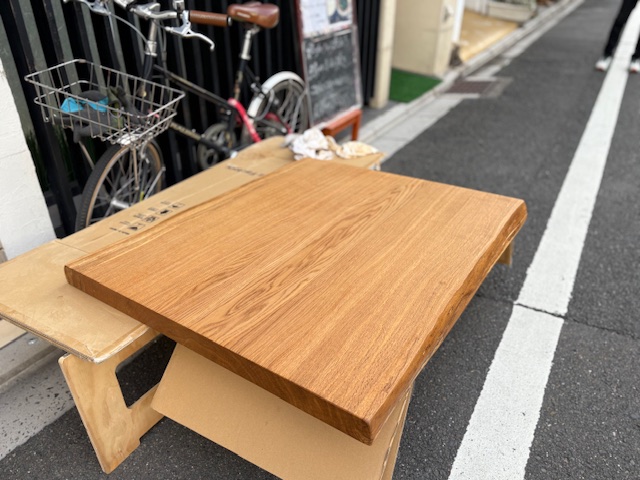 この楢材の一枚板テーブルも北海道へ旅立ちます。