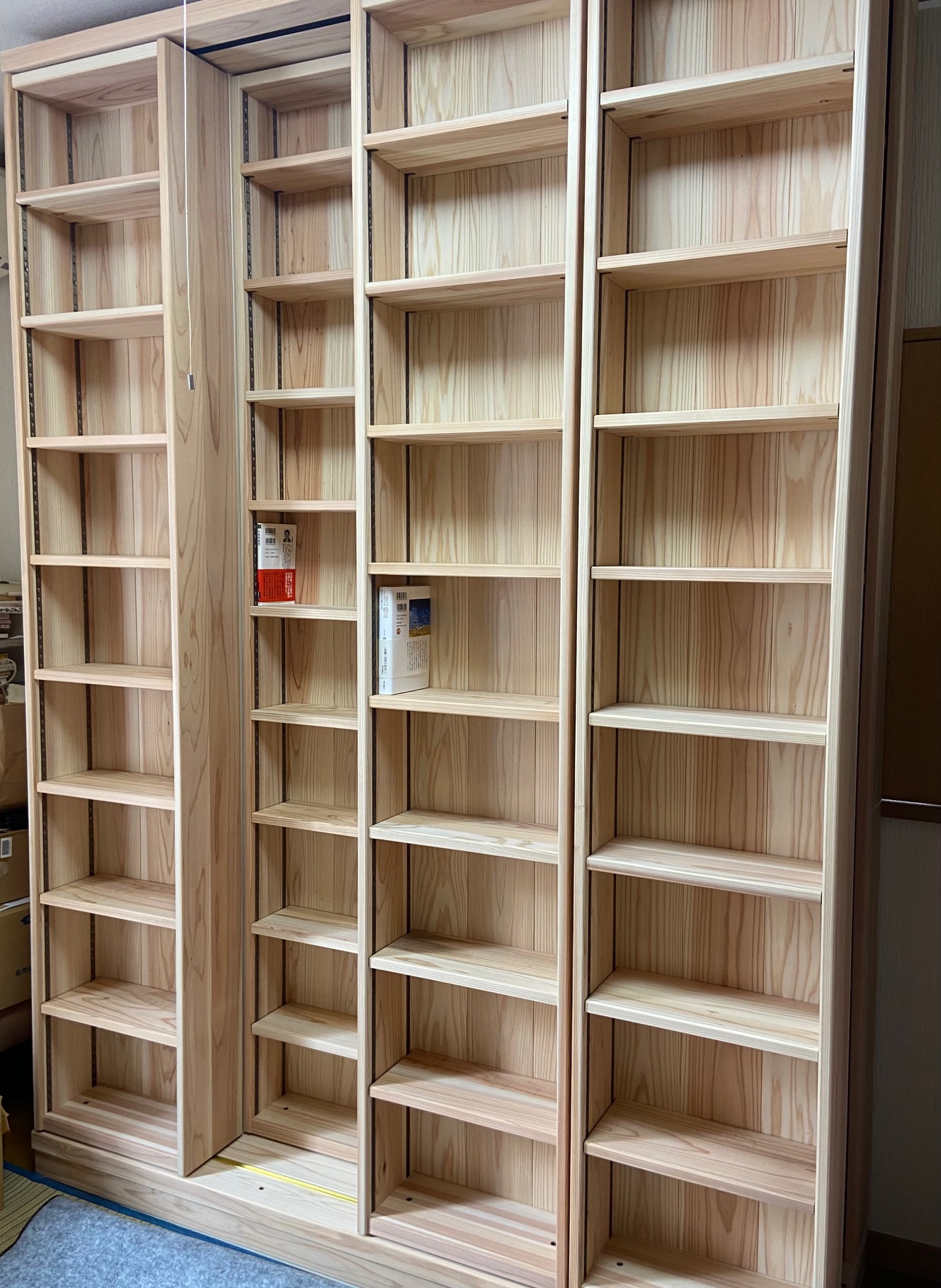 たすかーたそるて 家具のヤマカワがつかっているスライド書棚の杉材。