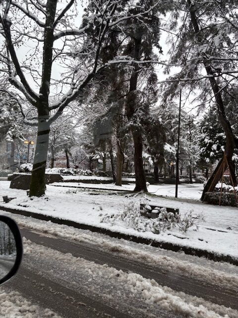 で。朝起きていったのですが、朝から雪。北陸道は雪と道が凍り始めてる?
