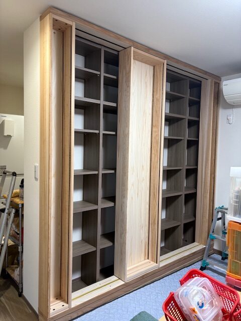 本来スライド書棚は移動しない箱、固定BOXを後ろ側に設置します、その前に可動する移動BOXを設置しるのですが、今回はなしで本棚を設置しました。