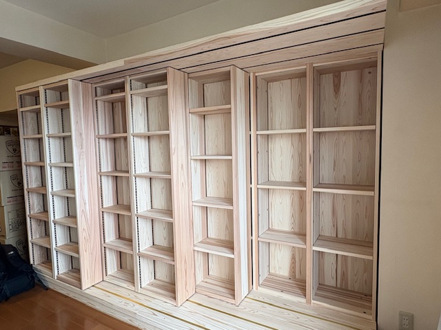 兵庫県尼崎市へ杉のオーダースライド本棚を納品しました。