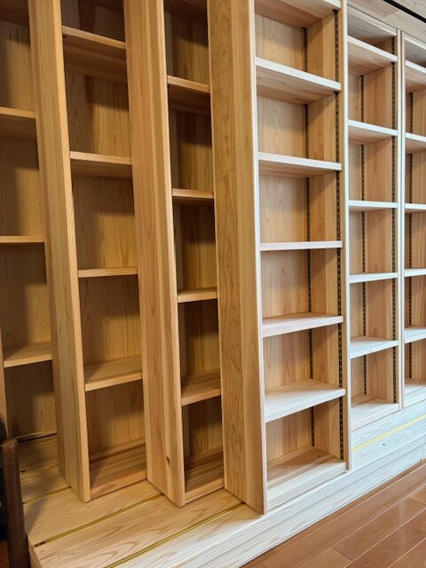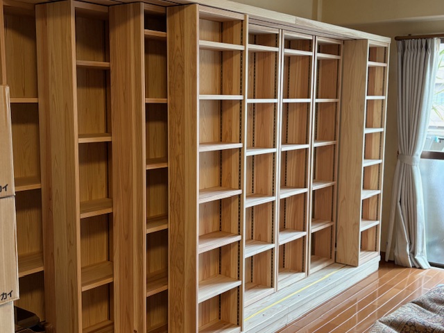 兵庫県尼崎市へ杉のオーダースライド書棚を納品しました。