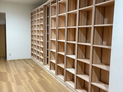 京都 宇治明星園 特別養護老人ホーム様へ 杉の無垢材のスライド書棚を納品しました。